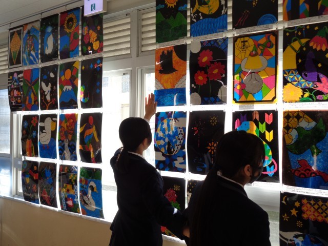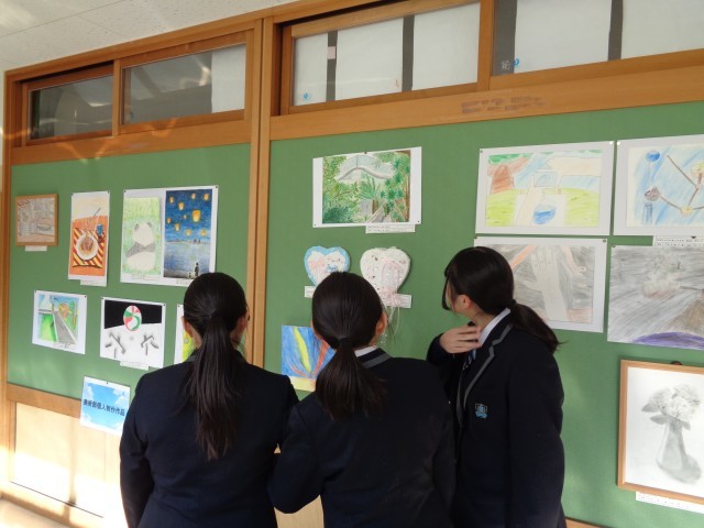 2月13日から14日まで文化発表会(展示の部)を開催しています。13日の午後には、全校生徒で展示物を鑑賞しました。校舎は色鮮やかな作品が壁一面に飾られ、一歩歩くと新しい表現が出会える、校舎全体がひとつの大きな「美術館」のようです。