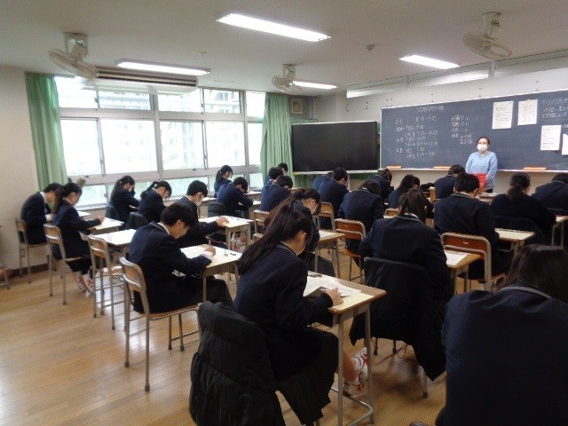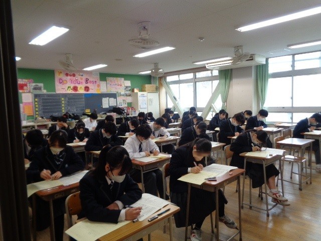 今日は学年末考査の最終日です。9年生にとっては中学生最後の定期考査です。程よい緊張感が漂う教室で、学習の成果を発揮しようと真剣な表情で問題に取り組んでいました。