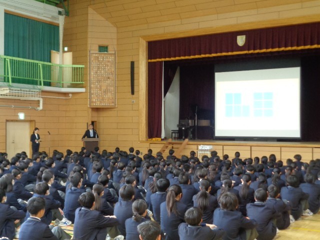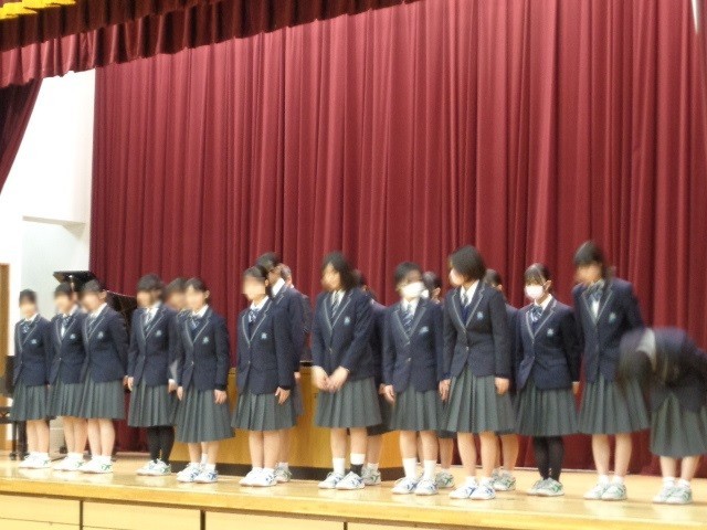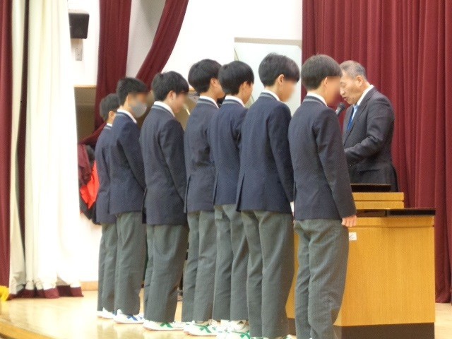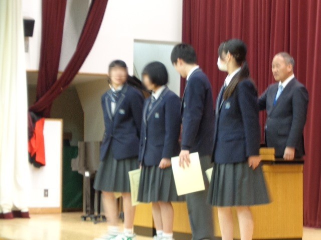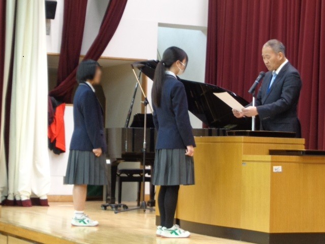 本日、令和7年度の修了式を挙行し、7年生と8年生の代表が校長先生より修了証を授与されました。校長式辞では「他喜力」について、どのような行いをすれば努力は報われるのかお話がありました。式の後には、美術、書道、女子バレー部、男子ソフトテニス部で優秀な成績を収めた生徒たちの発表と表彰が行われました。