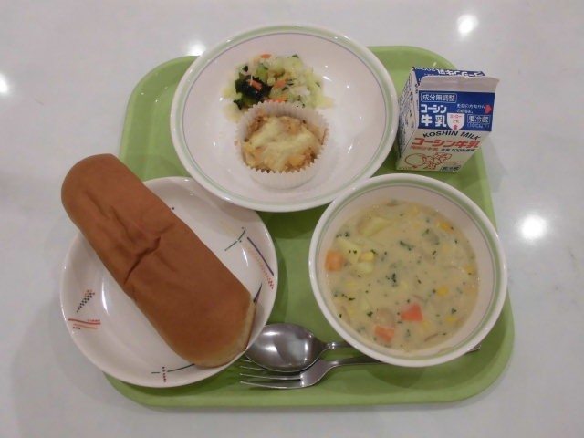今日の献立黒砂糖コッペパンツナのカップ焼きコーンシチュー和風サラダ牛乳