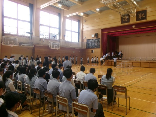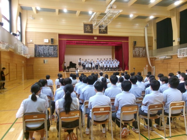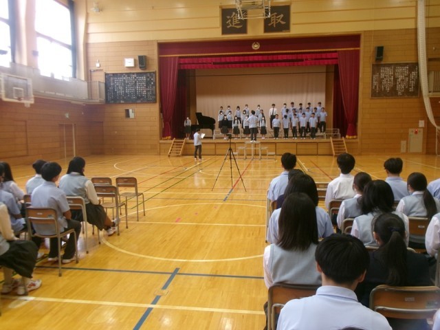 合唱コンクールの学年練習の様子です。9年生の学年練習は、実行委員がすべての進行を務め、生徒全員がその指示に従って協力しながら進めていました。具体的には、フロアの自席からステージに上がり、演奏してから自席に戻るまでの流れを確認し、全クラスが課題曲を歌いました。この時期は、他のクラスの演奏の出来栄えが気になる頃でもあり、歌う方も聴く方も真剣に取り組んでいました。
