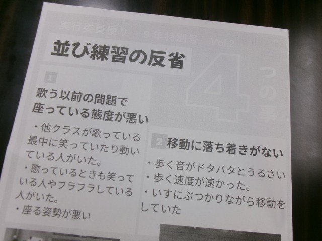 前日の合唱コンクール学年練習を受けて、実行委員が9年生の生徒に向けて反省と呼びかけを行っていました。実行委員は一晩でプリントを作成し、全員に配布して改善点を周知していました。内容には厳しい指摘もありましたが、その高い意識に周囲の生徒が応えていくことで、合唱コンクールはより良い行事になっていくはずです。本番まで3週間を切りました。生徒一人一人が力を合わせて頑張ってほしいと願っています。
