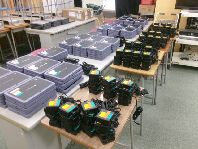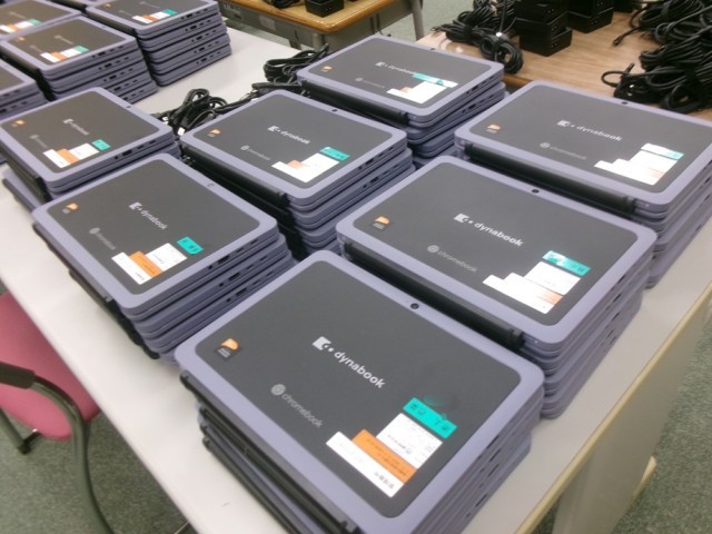 生徒用のタブレット端末が新しくなりました。以前のものよりサイズはやや小さくなりましたが、液晶部分が取り外せる仕様になったため、全体としては少し厚みが増した印象です。画面やキーボードが小さくなったことで、生徒たちは少し使いづらそうにしていますが、早く慣れてくれることを期待しています。