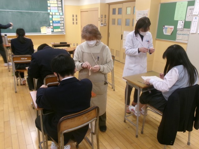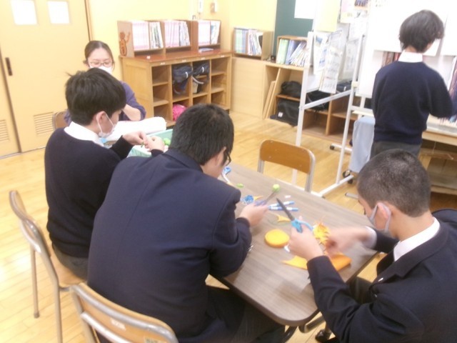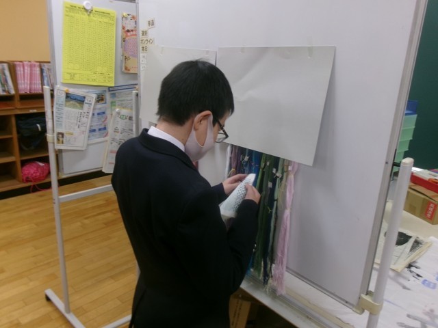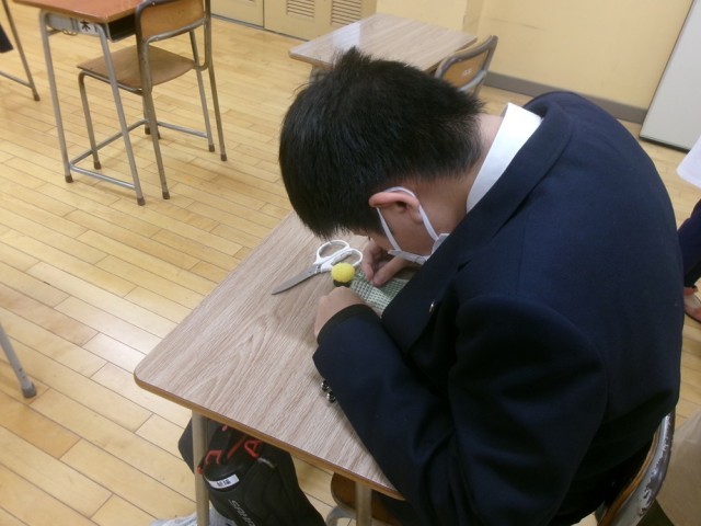 6組家庭科で行っている裁縫の授業の様子です。スウェーデン刺繍やフェルトを使い、それぞれの課題に合わせた作品づくりに取り組んでいます。刺繍用の糸は色の種類が豊富で、生徒は自分の好きな色を選んで制作しています。完成した作品の一部は、11月27日の小中交流会で小学生にプレゼントする予定です。