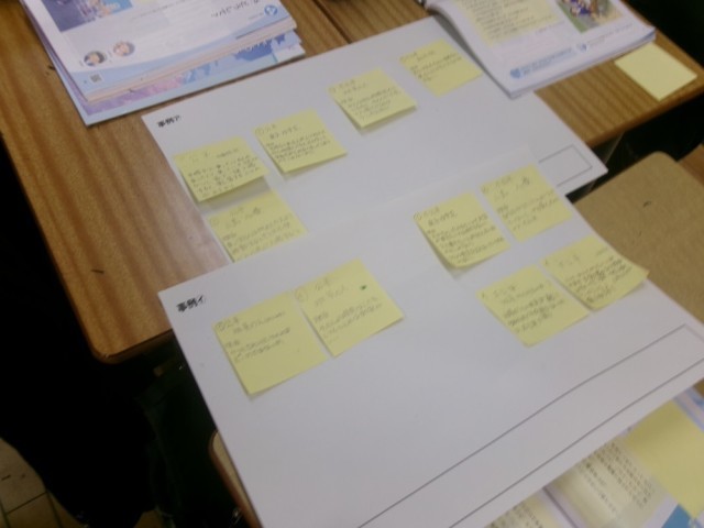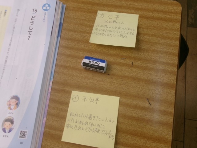7年生の道徳では、「公平・公正」について考える学習を行いました。まず、教科書にある2つの事例を読み、それぞれが「公平だと思うか」「不公平だと思うか」を個人で考え、付箋に意見を書き出しました。