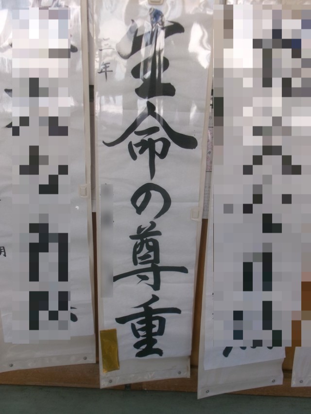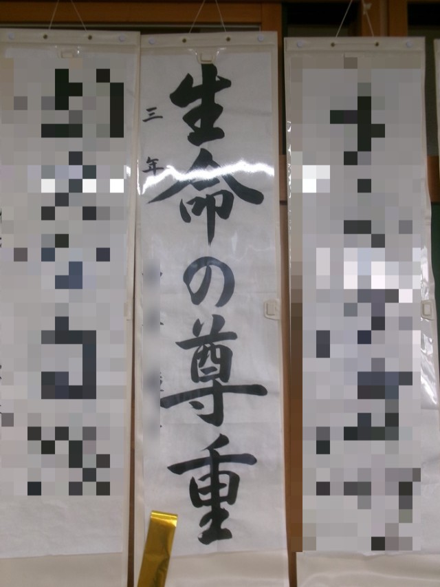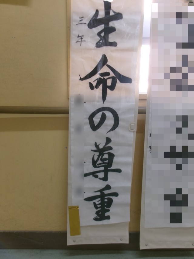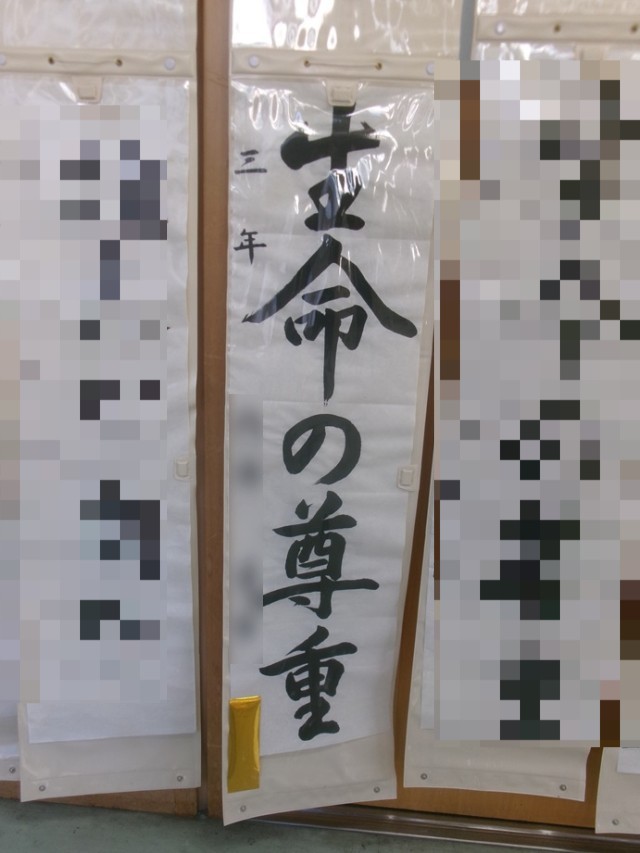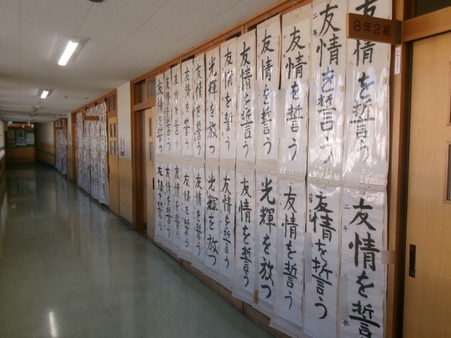冬休みの宿題だった書き初めを教室前の廊下に展示しています。昨品の中から、金賞・銀賞・銅賞が選出されました。ここでは、9年生の金賞受賞作品を紹介します。