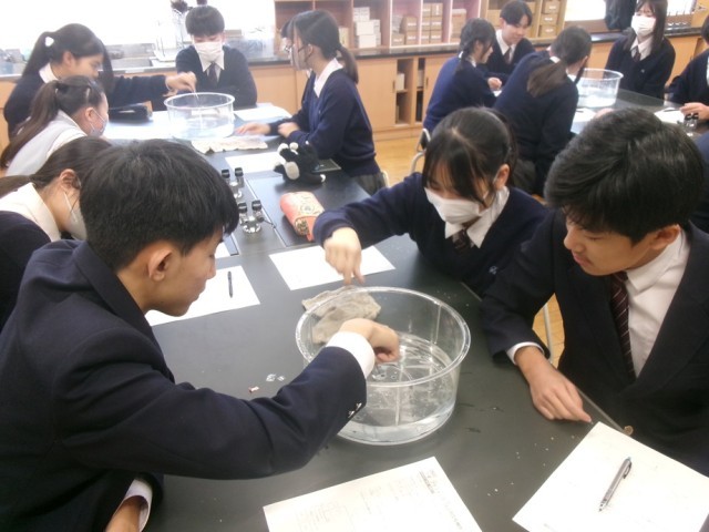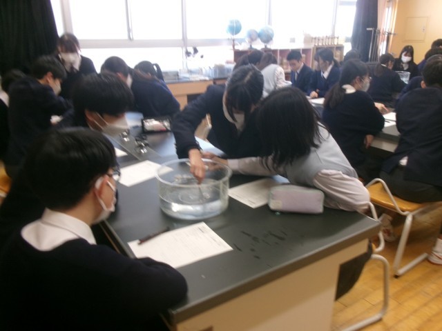 9年生の理科では、プラスチックの性質を利用して5種類のプラスチックを分類する実験を行いました。水や飽和食塩水に浮くか沈むかを調べながら、それぞれの違いに着目して分類を進めていました。