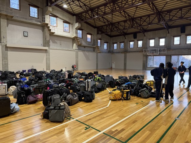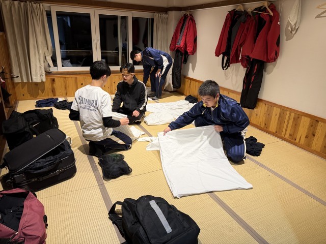 起床は6時です。寝具の片付けや部屋の掃除、荷物の整理をして体育館へ運びました。