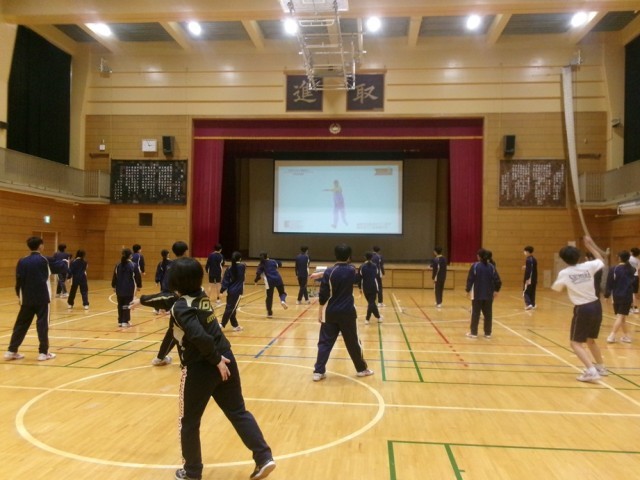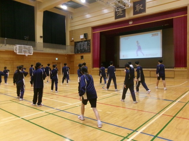9年生の保健体育では、映像教材を活用したダンスの授業を行っています。アップテンポのリズムに合わせて、小刻みなステップや腕の動きを組み合わせる振り付けに挑戦していますが、想像以上に難しく、生徒たちは何度も繰り返し練習しながら動きを身に付けています。