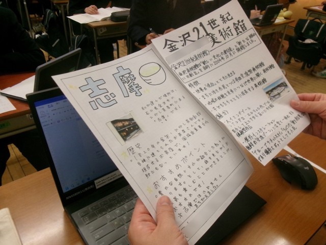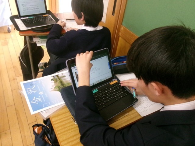 先月、8年生のスキー教室が無事終了しました。その余韻が残る中、総合的な学習の時間では早くも5月に実施予定の修学旅行に向けた事前学習が始まっています。今日は、見学地について調べていて、訪問先の歴史や文化について学びを深めていました。