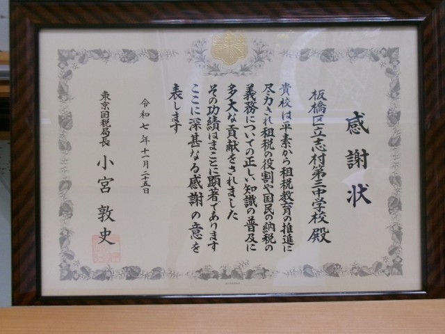 本校では、毎年「税についての作文」に応募するとともに、継続して租税教室に取り組んでいます。こうした活動が評価され、東京国税局より感謝状をいただきました。