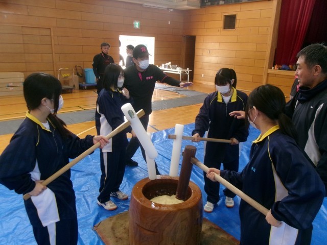 当日は100名を超える生徒が参加し、会場は終始大いに盛り上がりました。杵と臼で餅をつく貴重な体験に、生徒たちは目を輝かせながら取り組み、伝統行事の楽しさと地域の温かさを実感している様子でした。