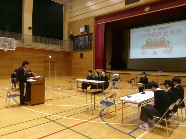 東京弁護士会の弁護士の皆様にご協力いただき、9年生が模擬裁判の体験授業を行いました。体育館に簡易的ではありますが、裁判官席・検察官席・弁護士席を設け、実際の裁判さながらの進行で授業が行われました。