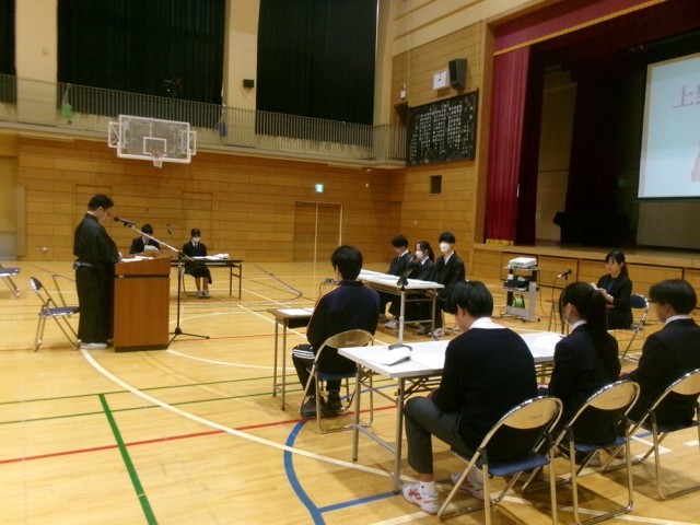 裁判の案件は「上野無銭飲食事件」。被告人や参考人、廷吏の役には教員も参加し、生徒は裁判員として証言や証拠をもとに真剣に議論を行いました。実際の裁判の流れを体験することで、裁判の仕組みや公正な判断の大切さについて理解を深める貴重な学習となりました。