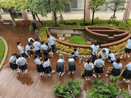 大根の栽培。中庭での作業が危ぶまれましたが、雨がやんだので隙間を縫って種を植えることができました。良かったですね。