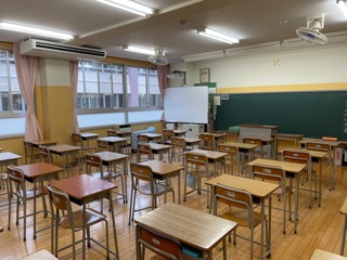 今朝の某教室風景。整理整頓・換気をして生徒の登校を待っています。