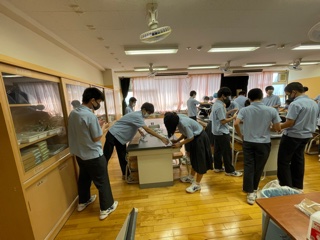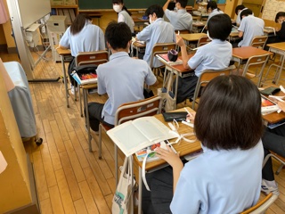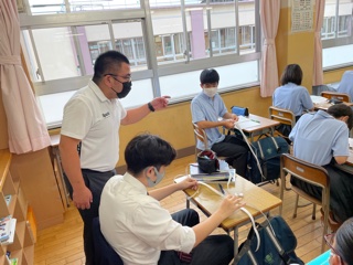 教室でテープを五打点ずつ切り取ってまとめる作業中の生徒たち。