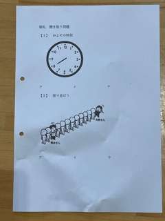 時計を使ったパズルと文章題の聞き取りです。きちんと聞き取っていないと間違える可能性がある問題で、生徒は遊び感覚で聞き取りにチャレンジしていました。