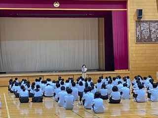 国語科の田村先生から朝読書について話がありました。本校では全学年で朝読書を実施しています。10分間の朝読書を苦痛に感じている生徒もいるかもしれません。田村先生は卒業生など先輩が朝読書について書いた文章を紹介しながら、朝読書の意義や大切さ、効果について具体的に話してくれました。