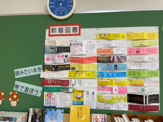 図書室の新着図書コーナーです。新刊本なので帯がついています。その帯を並べて掲示してあります。帯はその本の内容に興味を持ってもらうようなコピー(宣伝文)が書かれています。写真のように並べてあるとどの本を選ぼうか悩みますね。