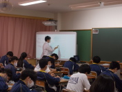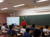 一次関数のまとめの授業です。途中で傾きが変わるグラフなど応用問題について学習しています。グラフと数式の関係は理解できたでしょうか