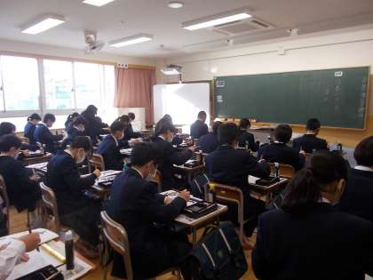 書写の授業で行書を学んでいるところでした。小田島先生は机間指導で一人一人に筆遣いを教えながら、全体には姿勢をきちんとするように注意喚起していました。確かに普段以上にきちんとした姿勢を保たなければ上手に書けませんからね。静かに集中して取り組んでいました。