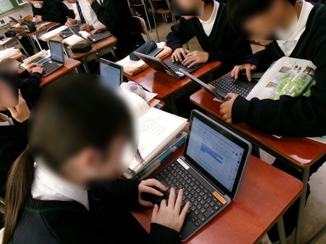 9学年国語の授業では、松尾芭蕉の代表作「おくのほそ道」応用編と題して、各地で詠まれた俳句、現代語訳、感想を「スライド」にまとめます。生徒が自分で土地や俳句を選択し、図書館の本やChromebookを活用して調べ、まとめますが、数時間の授業の中で「何を使うか」「どの順番で進めるか」等を計画しています。先生から一方的に話を聞くのではなく、生徒が主体的に取り組めている様子です。単元の最後には、発表会を行う予定だそうですが、旅行気分で楽しめそうですね。