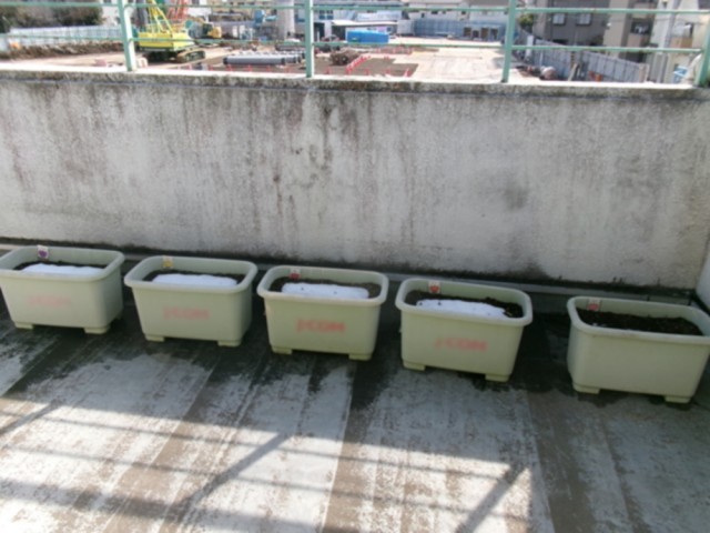 プランターは職員室の外にあります。今朝まで土がほとんど雪に覆われていましたが、