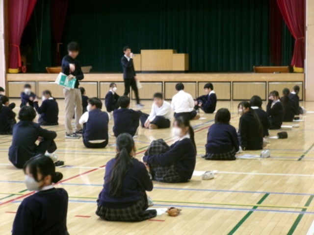 受検する9年生は、6校時に体育館に移動して前日指導を受けました。