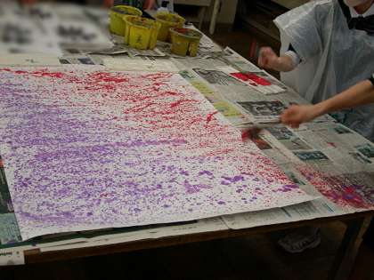 袋で作った上着をかぶり、紙に向かって「はけ」を振っている様子が。