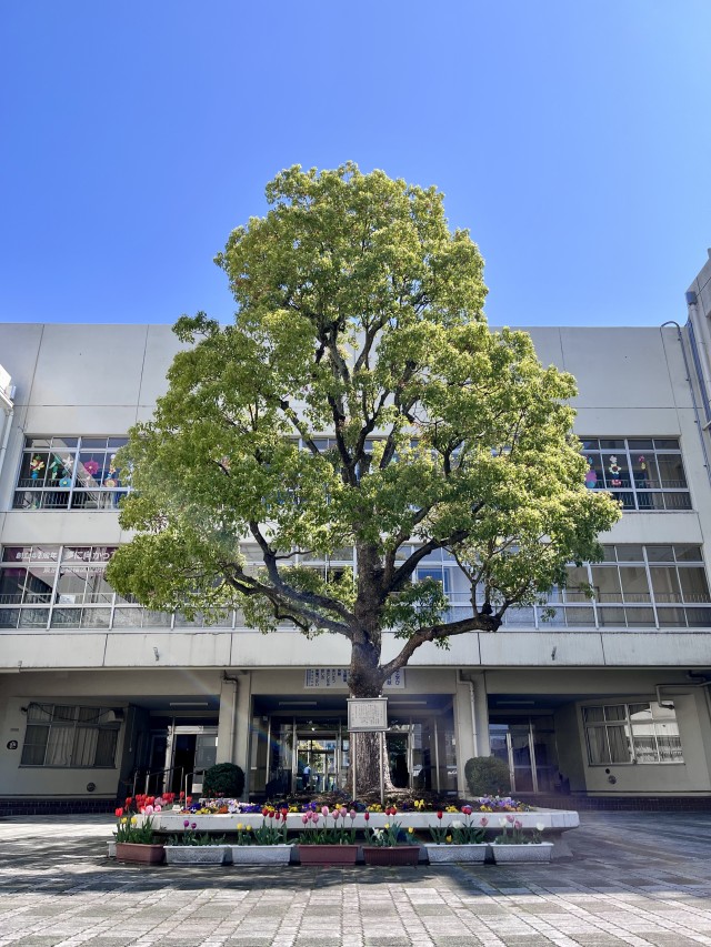 *校章の由来の中でも述べられているように、「くすのき」は本校の校樹です。本校創立時に正面玄関前広場に植えられ、以来、本校生徒の健やかな成長を慈しみ見守っています。また、本校生徒の心のよりどころになり、くすのきの木蔭で語り合う姿をよく見かけますし、卒業生が訪ねてくると目を細めて見上げ、中学校時代を懐かしんでいるようです。これからも本校の象徴であり続けることでしょう。