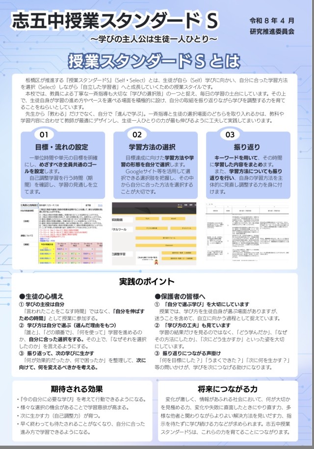 (1)「自己調整学習」のプロセス(学習目標の設定・学習方法の選択・振り返り)を確立することで、生徒の興味や習熟度に応じた「個別最適な学び」を実現し、主体的に学ぶ力と確かな学力を育成する。