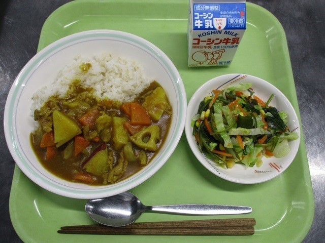今日の体も心も温まるメニューは、昨日の担々麺に続き、今日もスパイシーな献立です。たっぷりの根菜が入ったカレーライスで、じゃがいも・さつまいも・れんこんの食感が楽しめました。豚肉のうま味がしっかり溶け込んだ濃厚な味わいで、スパイスの香りが程よく効いた一皿でした。