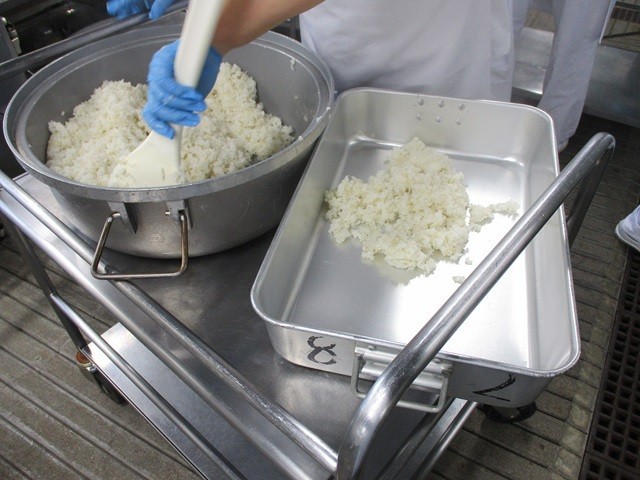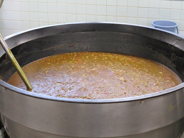 写真は、ご飯の配缶の様子と、カレーの調理風景です。
