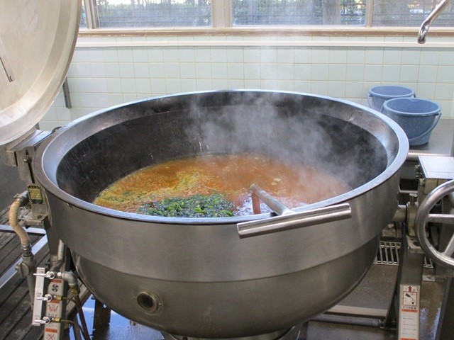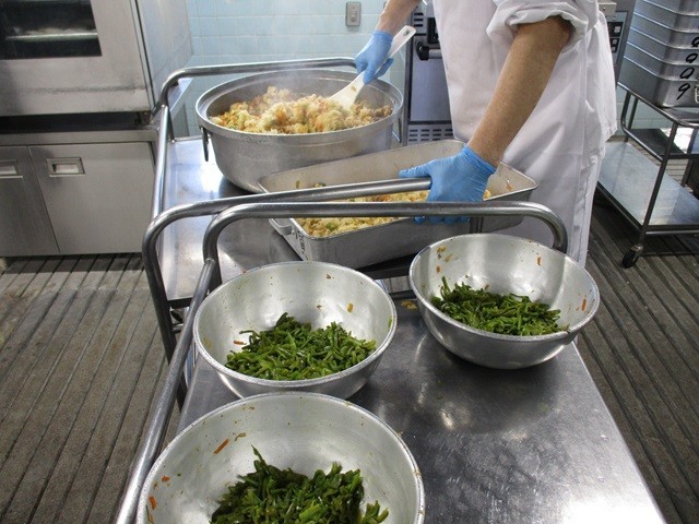 写真は、ご飯の配缶の様子、もずく汁の調理風景です。
