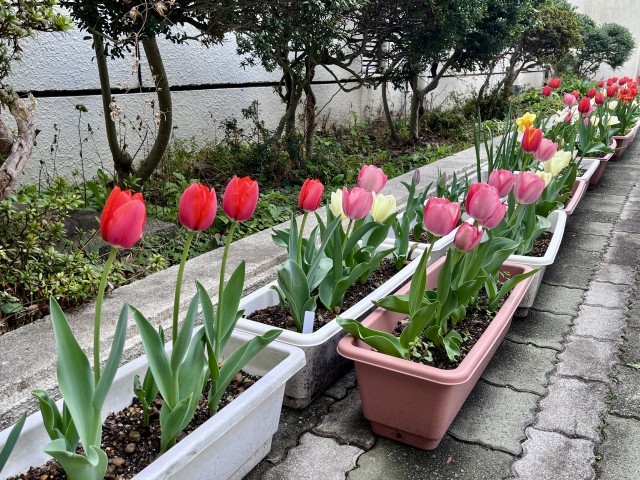 3月25日は小学校の卒業式です。来春本校に入学する児童の皆さんのために、在校生と地域のボランティアの方々が植えたチューリップが、入学式を待たずに咲き始めました。