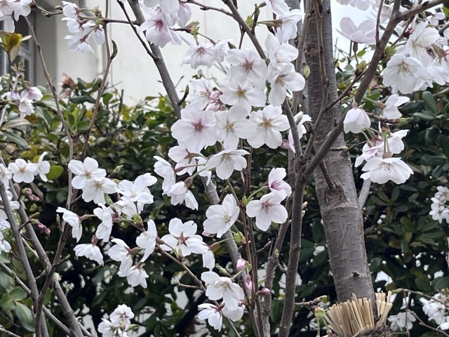 (2枚目の写真は、生徒ボランティアと地域の方で植えた新入生の入学を祝うチューリップ、3枚目の写真は、今年度、地域の方から贈られ植樹された木に咲いたサクラです。)