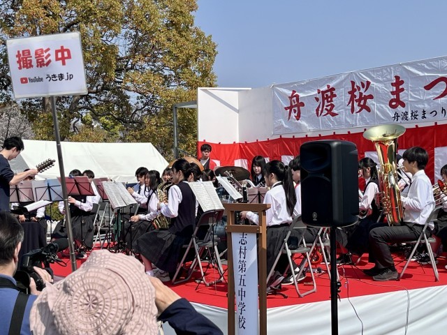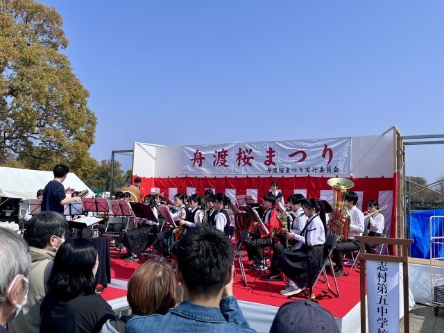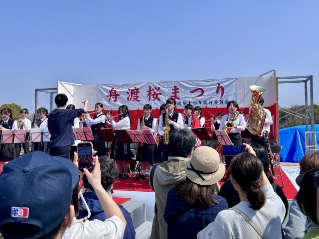 先週の蓮根桜まつりに続き、今週は舟渡桜まつりが開催されました。朝から気温が上がり、会場の都立浮間公園には多くの人出がありました。式典に先立ち、本校吹奏楽部による演奏が盛大に行われました。今年もNPO法人うきま.jpによるYouTube撮影も行われていました。演奏後には、舟渡町会リバーサイド舟渡の皆様から部員に舟渡ラーメンが振る舞われ、部員たちは笑顔でおいしくいただきました。