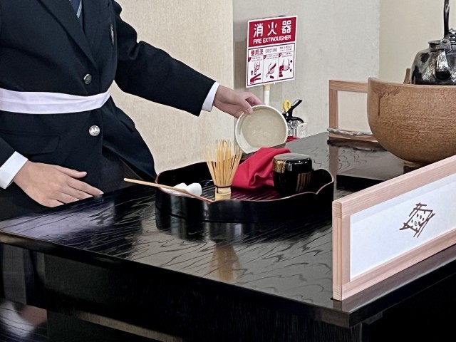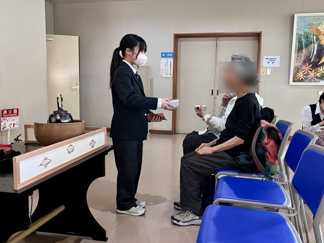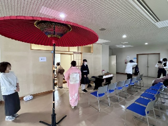 交差点を挟んだ舟渡ホールでは野点が行われ、本校茶華道部の部員がお手伝いをしました。日頃ご指導いただいている部活動指導補助員の先生のご指導を受けながら、来場された方にお茶をたてる機会もいただきました。