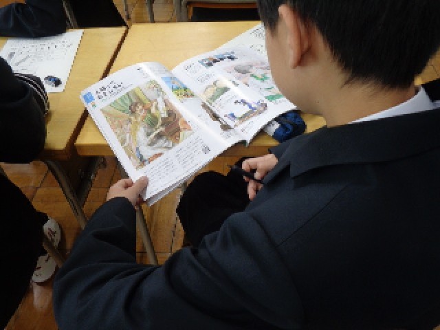 英語では、Unit1の扉ページを題材に動画を視聴し、その内容について自分の感想も含め、1分以内で英語による説明を行う活動に取り組みました。説明はChromebookで自撮り録画し、Classroomを通して提出しました。
