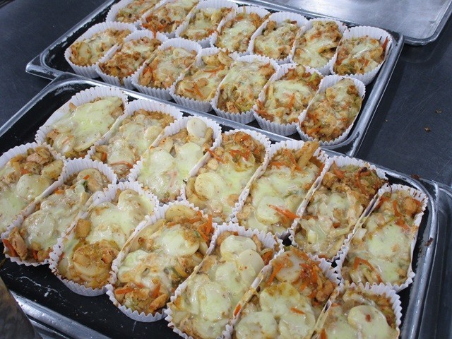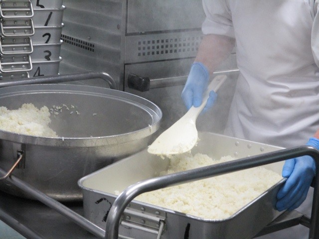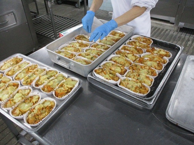 写真は、ホワイトソースの調理風景、パプリカライスの配缶の様子です。