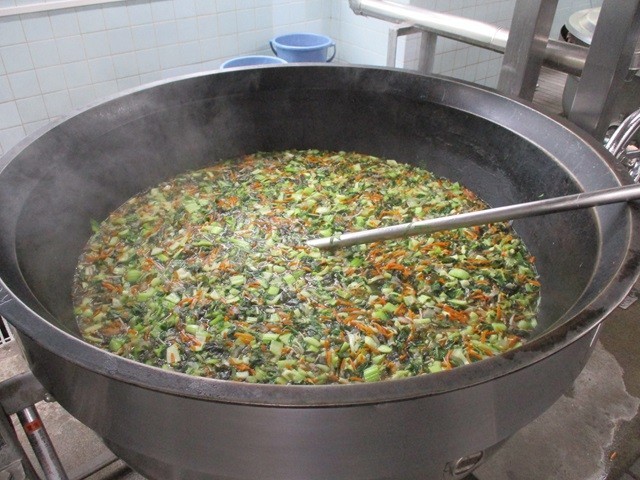 写真は、スープの調理風景、麺の配缶の様子、スティックスウィートポテトの配缶の様子です。