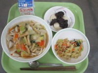 写真は、ごはんの配缶の様子、タコライスの調理風景、もずくスープの調理風景です。
