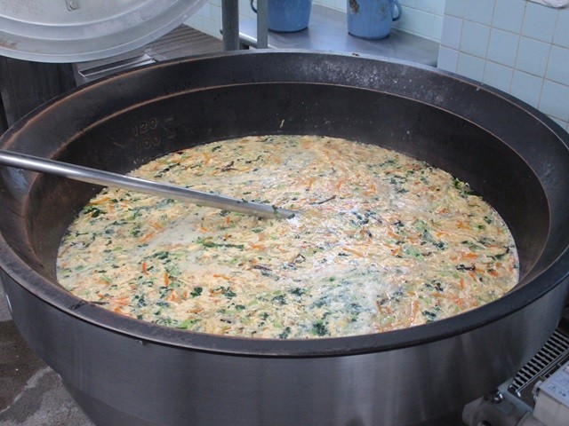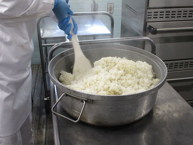 写真は、ご飯の作業風景とかきたま汁の調理風景です。