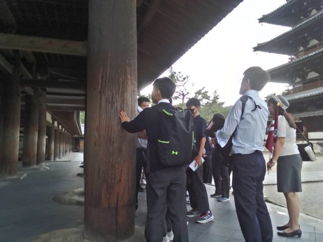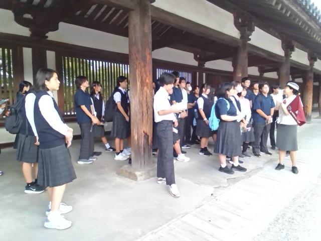 現地では、バスガイドさんの案内のもと、クラスごとに約1時間かけて見学しました。五重塔や大講堂を巡り、金堂ではアルカイックスマイルをたたえた釈迦如来坐像を、大宝蔵院では玉虫厨子、聖徳太子の肖像画、百済観音など、貴重な文化財を見学しました。