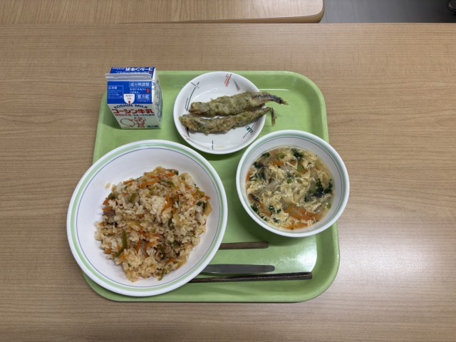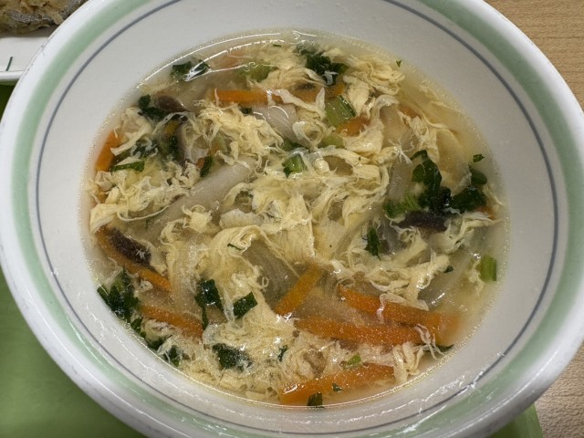 今日はとれたて村給食で、長野県駒ヶ根市産のしめじがたっぷり入った、優しい味の卵スープ。