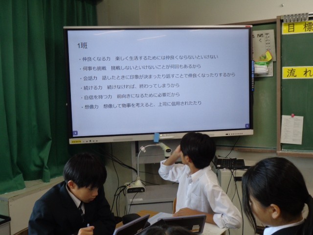 授業のはじめに、生徒たちは「将来、社会の中で自分の役割を果たし、自分らしく生きていくために、どんな力が必要か」を考えました。ホワイトボードには「勉強」「礼儀」「知識」「強いメンタル」「コミュ力」「行動力」「優しさ」「ポジティブ思考」「判断力」など、さまざまな言葉が書き出されました。