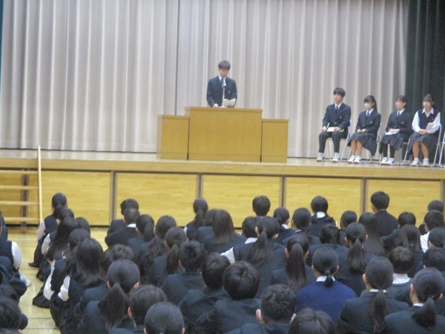 生徒会長からは、授業中の水筒使用についてと、11月21日から始まるいじめ撲滅週間の取組について話がありました。水筒の使用は生徒総会で出された質問の一つで、授業中の水分補給はマナーを守れば可能であることが公式に伝えられました。