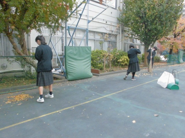 落ち葉掃きボランティアの初日には、9年生の生徒が通常より早い時間に登校し、活動に参加しました。地域の方々も3名協力してくださり、校門から交差点までの歩道、くすのき周辺、中庭・テニスコート周辺の落ち葉を丁寧に掃き集めました。