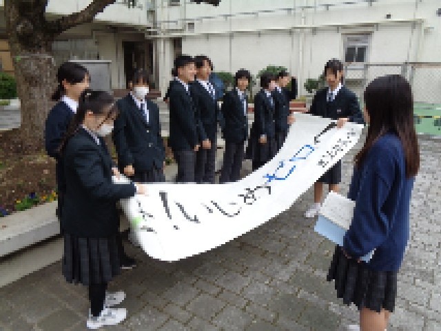 3連休明けの今日は、いじめ撲滅週間の2日目です。朝のくすのき前では、生活委員会と有志生徒によるあいさつ運動が行われ、登校してきた生徒に元気な声が届けられていました。